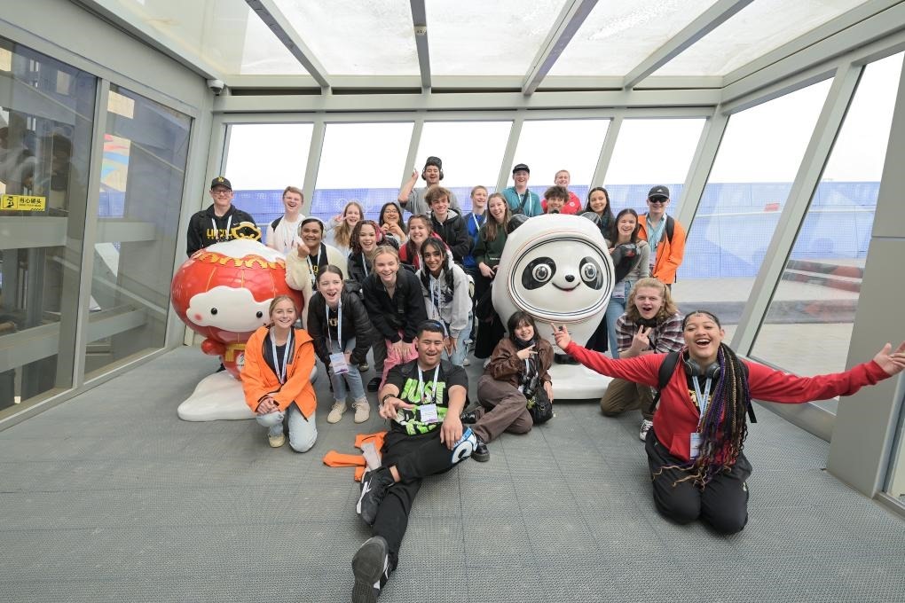2024年3月21日,美國華盛頓州中學(xué)生代表團(tuán)的成員在首鋼滑雪大跳臺上與冰墩墩、雪容融合影。新華社記者 李鑫 攝