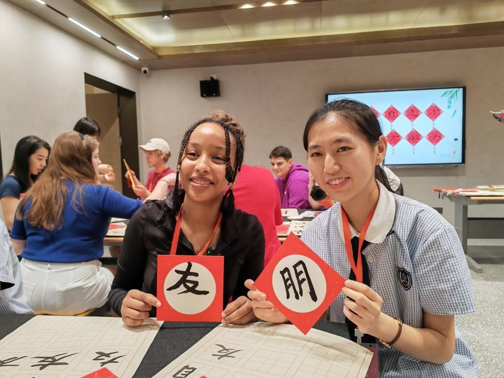 2024年6月8日,在河北省石家莊外國語學(xué)校,美國山谷高中學(xué)生娜斯拉(左一)在上漢字書法課。新華社記者 杜一方 攝