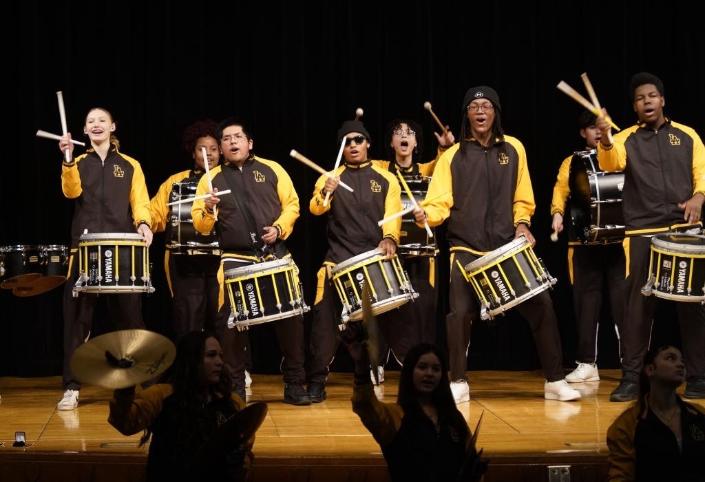 2024年1月30日,在美國華盛頓州林肯中學(xué),學(xué)校鼓樂隊在美國中學(xué)生赴華交流歡送儀式上表演。新華社記者 吳曉凌 攝