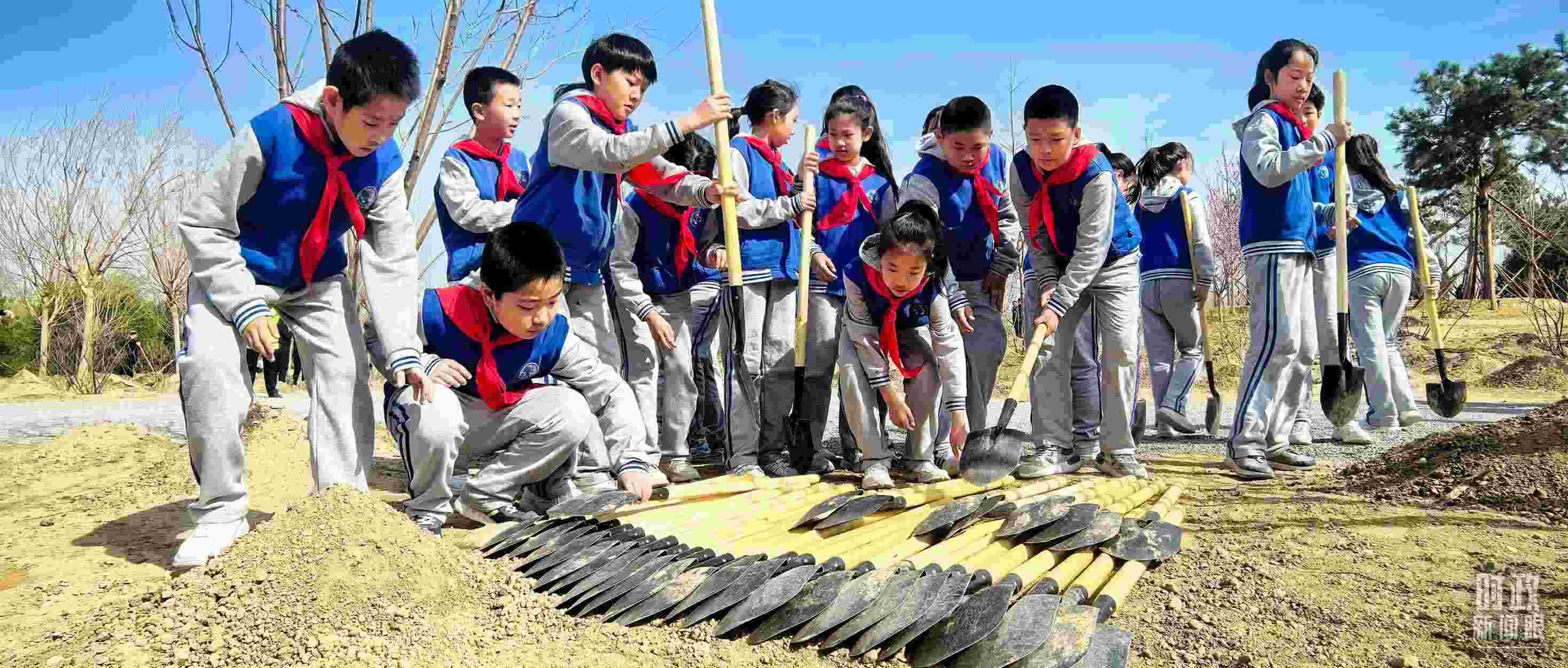 △少先隊(duì)員拿起鐵鍬參加義務(wù)植樹。(總臺央視記者范凱拍攝)