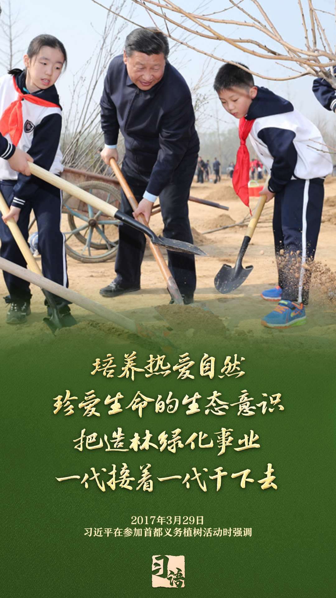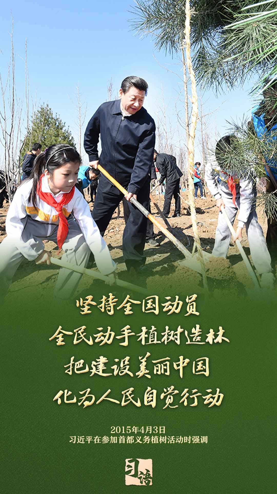 “植樹造林是一件很有意義的事情,是一項功在當代、利在千秋的崇高事業(yè),要一以貫之、持續(xù)做下去?!弊?013年以來的13個春天里,無論晴雨,習近平總書記都會拿起鐵鍬,與干部群眾一起參加首都義務(wù)植樹活動。鏟土造坑、培土圍堰、提水澆灌,總書記身體力行種下綠色的希望,對擴綠興綠護綠、建設(shè)美麗中國提出明確要求。一起學習。