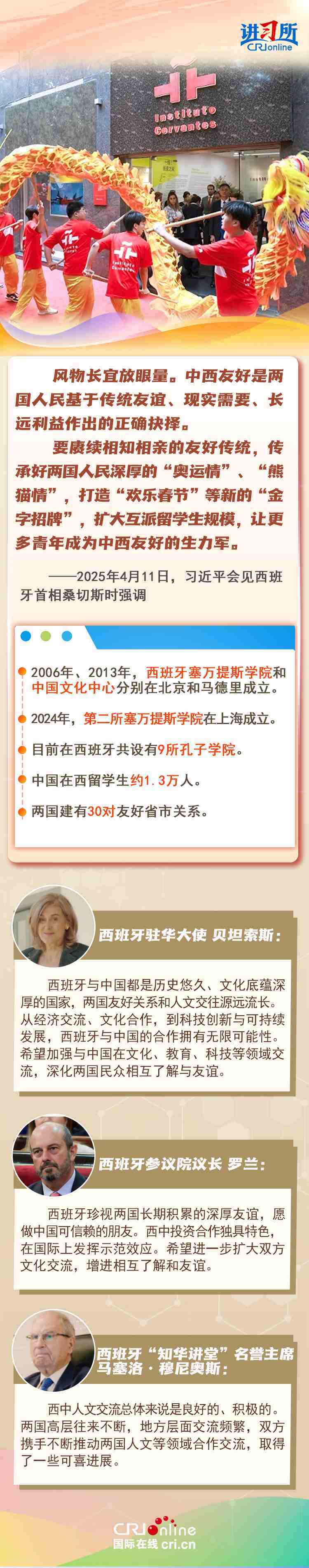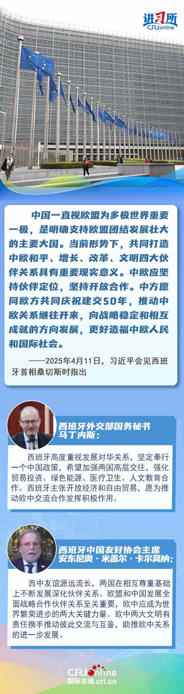 今年是中西全面戰(zhàn)略伙伴關(guān)系建立20周年,也是中歐建交50周年。多年來,中西兩國領(lǐng)導人保持密切互動,秉持互尊互信、互利共贏精神,兩國在深化貿(mào)易、投資、科技創(chuàng)新、綠色能源等領(lǐng)域取得豐富合作成果,雙邊關(guān)系走在中國同歐洲國家關(guān)系前列。在西班牙人士眼中,良好的對華關(guān)系對西班牙、歐洲和世界具有重要意義,將會為兩國人民帶來更多實實在在的福祉,也將共同創(chuàng)造更美好的未來。