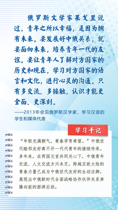 中華民族和俄羅斯民族都有悠久的歷史、古老的文明、燦爛的文化,都是偉大的民族。近年來,習(xí)近平主席常常引用中國詩詞古語、俄羅斯諺語名言等,寄語中俄關(guān)系發(fā)展和全人類和平與發(fā)展。這些重要論述,蘊(yùn)含對文明、歷史的深邃思考,指引著新時代的中俄關(guān)系不斷向前,為世界百年變局中的人類文明進(jìn)步事業(yè)指明方向。