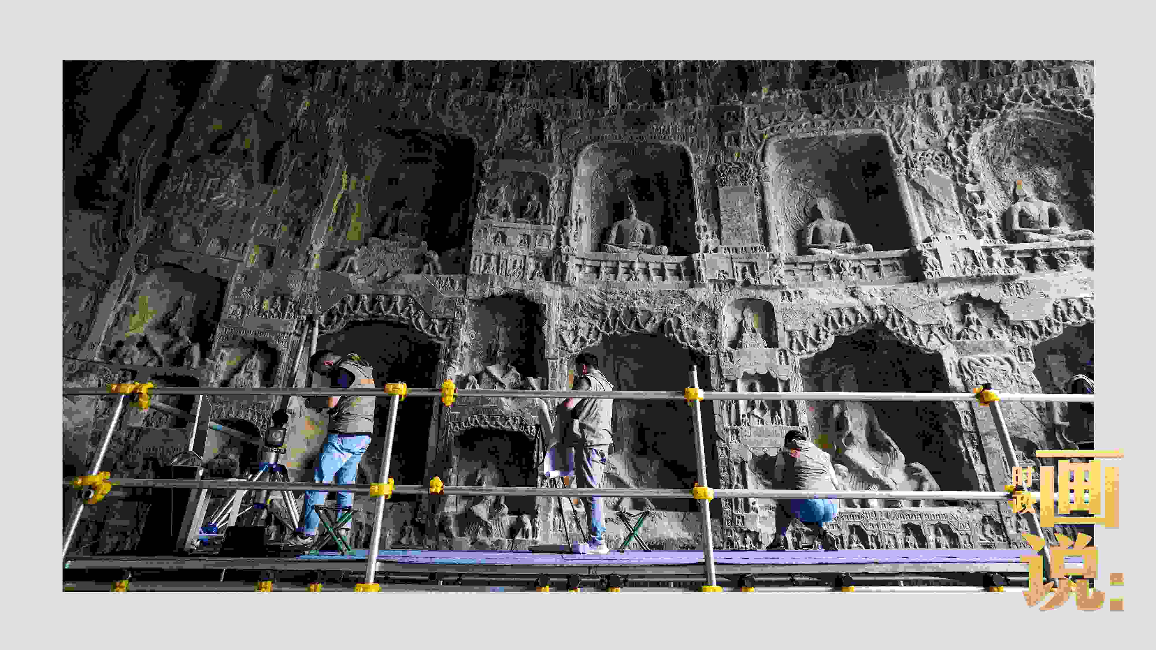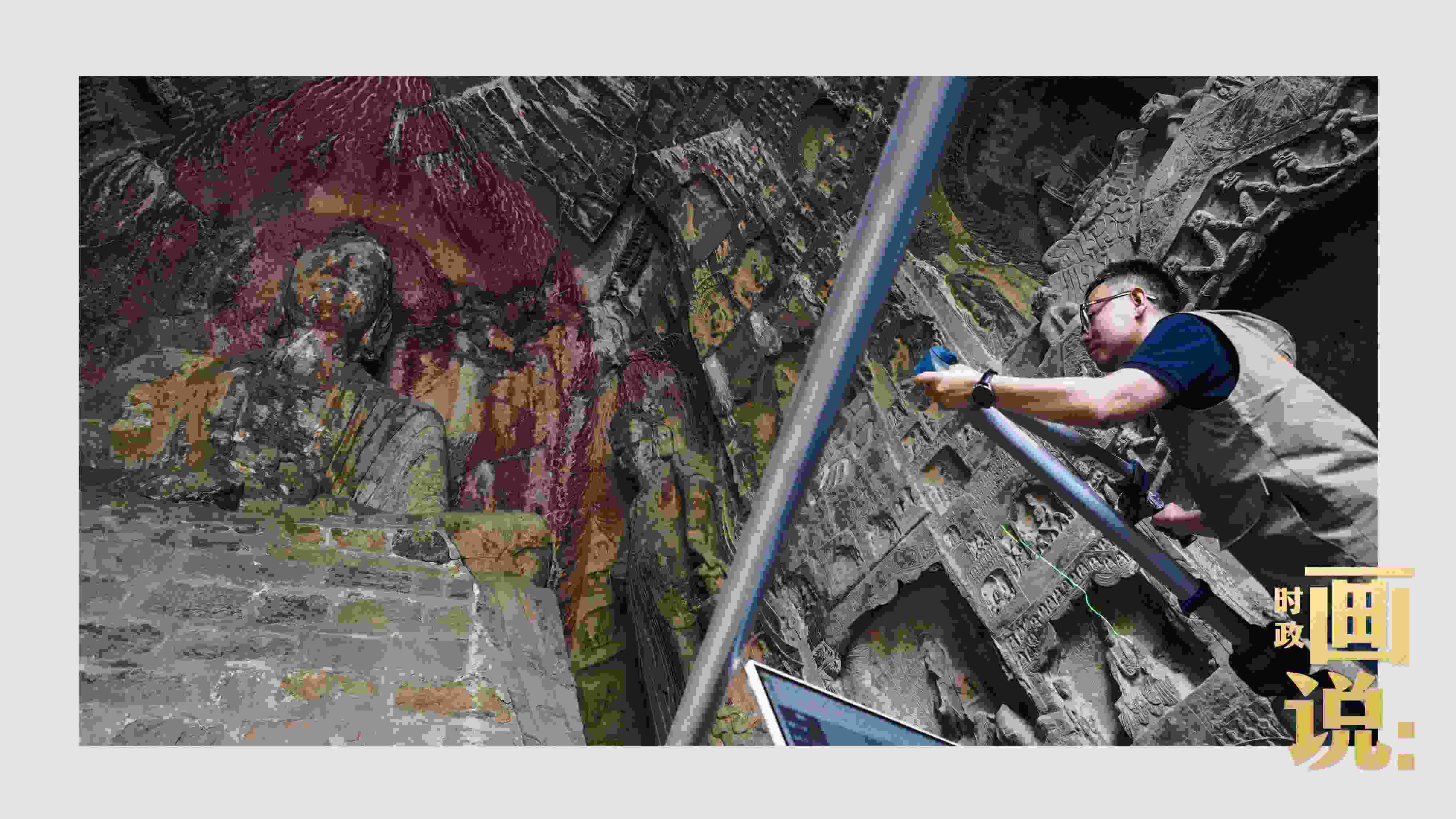 △龍門石窟研究院工作人員在古陽洞使用關(guān)節(jié)臂掃描儀對佛像進(jìn)行數(shù)字化掃描