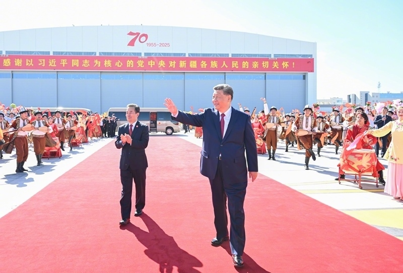 25日中午,習近平總書記在烏魯木齊出席新疆維吾爾自治區(qū)成立70周年慶?;顒雍螅藢C返回北京。在烏魯木齊市區(qū)和機場,新疆各族群眾熱情歡送總書記。(文字記者:張曉松、朱基釵;攝影記者:謝環(huán)馳、申宏、李琰)
