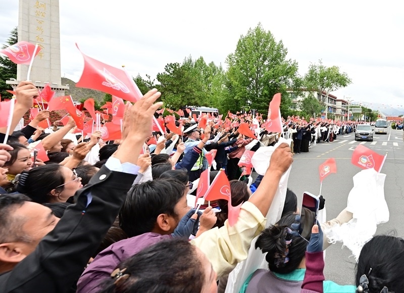 8月20日中午,中共中央總書(shū)記、國(guó)家主席、中央軍委主席習(xí)近平率中央代表團(tuán)乘專(zhuān)機(jī)抵達(dá)拉薩,出席西藏自治區(qū)成立60周年慶祝活動(dòng)。習(xí)近平等從機(jī)場(chǎng)乘車(chē)到住地途中,各族群眾在街道兩旁熱情歡迎。