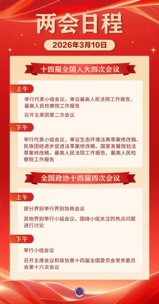 兩會日程預告丨3月10日:人代會審議“兩高”工作報告等 政協(xié)舉行界別協(xié)商會議和小組會議