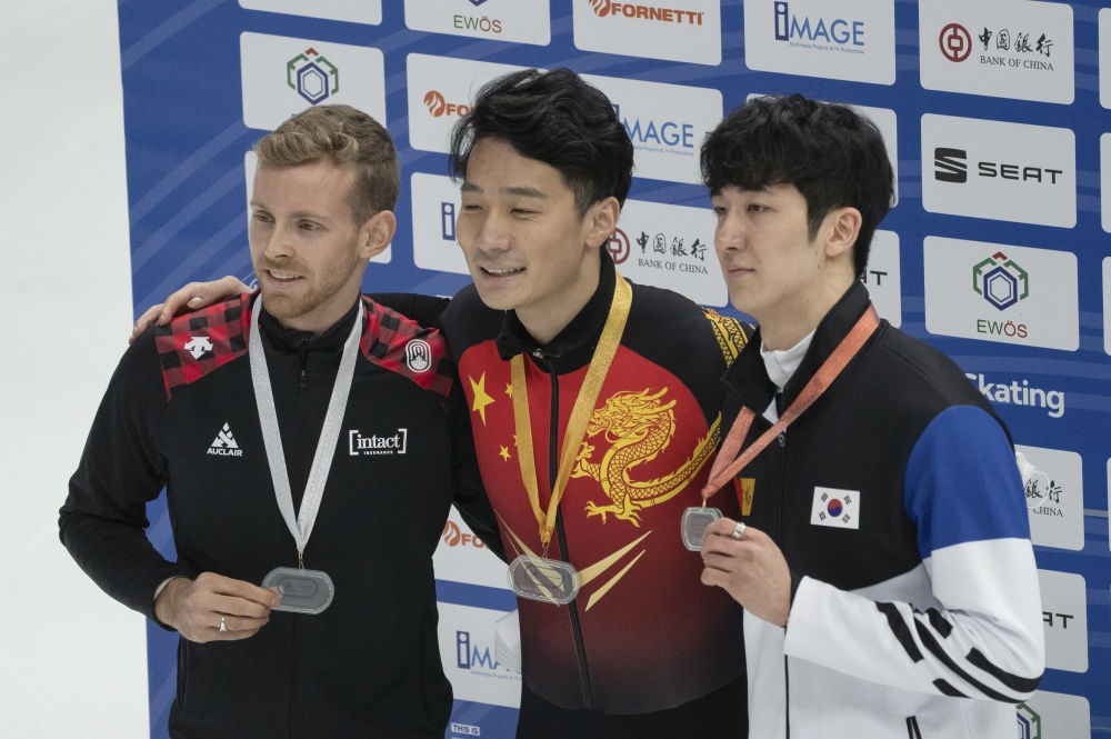 溫哥華冬奧會冠軍張會展示北京2022年冬奧會火炬?!〗x 攝