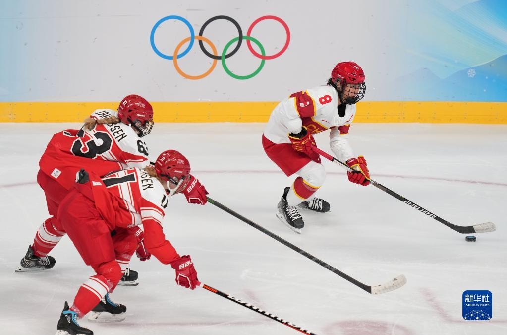 2月4日,中國(guó)隊(duì)球員林綺琪(中)在比賽中進(jìn)攻。當(dāng)日,在五棵松體育中心舉行的北京冬奧會(huì)女子冰球小組賽中,中國(guó)隊(duì)以3比1戰(zhàn)勝丹麥隊(duì)。新華社記者 薛宇舸 攝