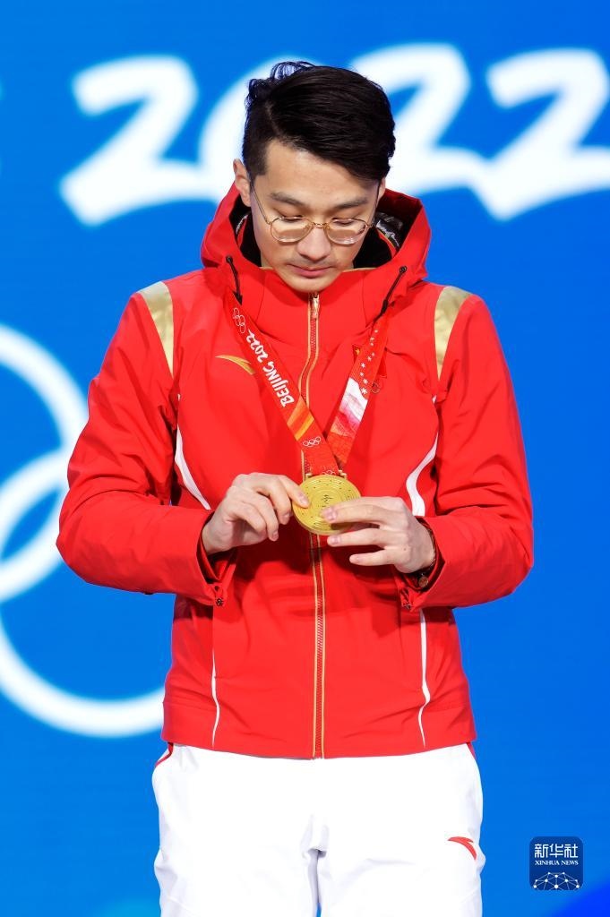 2月8日,冠軍中國隊選手任子威在獎牌頒發(fā)儀式上。