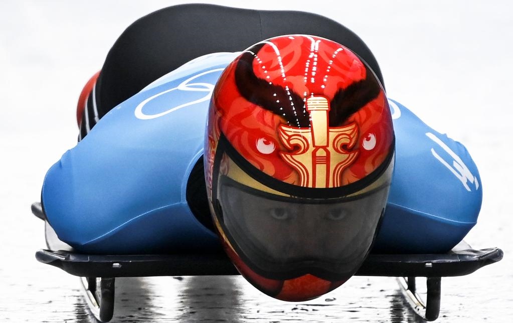 2月10日,中國選手殷正在北京冬奧會男子鋼架雪車項目比賽中。新華社記者賀長山攝