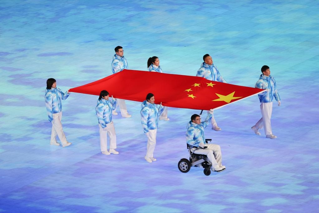 3月4日晚,北京2022年冬殘奧會開幕式在北京國家體育場舉行。這是中華人民共和國國旗入場。新華社記者 馬希平 攝