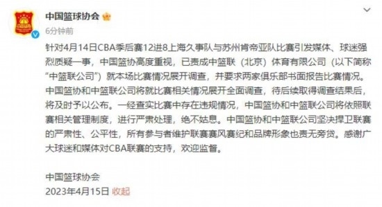 CBA聯(lián)賽官方微博15日凌晨發(fā)布消息表示:針對4月14日2022-2023賽季CBA聯(lián)賽季后賽12進(jìn)8、上海久事隊(duì)與蘇州肯帝亞隊(duì)比賽引發(fā)媒體、球迷強(qiáng)烈質(zhì)疑一事,中籃聯(lián)(北京)體育有限公司(以下簡稱“中籃聯(lián)公司”)高度重視,已就本場比賽情況展開調(diào)查,中國籃協(xié)也在第一時(shí)間責(zé)成中籃聯(lián)公司查明情況。中籃聯(lián)公司待后續(xù)取得調(diào)查結(jié)果后,將及時(shí)予以發(fā)布。