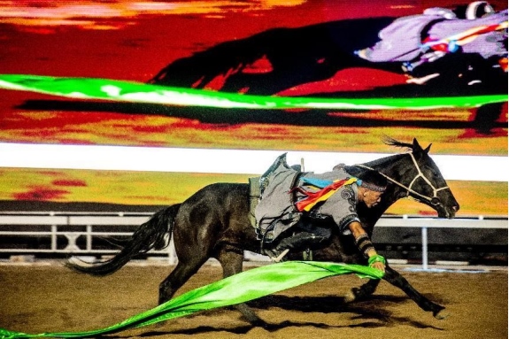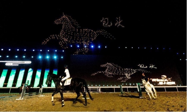 開幕式文體表演由《馬術(shù)方陣一馬當(dāng)先》、歌伴舞《我的城我的馬》、《名馬展示策馬揚(yáng)鞭》、《單馬技巧雙翼神馬》、《馬障礙秀躍馬揚(yáng)鞭》、《馬術(shù)秀人馬合一》、歌伴舞《騎跡包頭》、《無人機(jī)秀馬上精彩》八塊內(nèi)容組成。當(dāng)晚的賽汗塔拉馬術(shù)賽場(chǎng)流光溢彩、氣氛熱烈,場(chǎng)內(nèi)座無虛席、歡聲雷動(dòng)。20時(shí)30分許,主騎手手持國旗,副騎手手持馬城旗幟,運(yùn)動(dòng)員方陣、民族方陣、女騎方陣、馬主方陣入場(chǎng),騎手們精神飽滿、英姿颯爽,不時(shí)揮手致意,現(xiàn)場(chǎng)觀眾用熱烈的掌聲和歡呼聲,歡迎他們的到來。達(dá)茂旗9歲賽馬冠軍阿茹樂手持彩旗引出世界名馬亮相,40對(duì)人馬合一的“千古馬頌”表演震撼全場(chǎng),1000架無人機(jī)躍然天空,點(diǎn)亮“騎跡包頭 馬上精彩”的字樣……藍(lán)天、碧水、凈土的包頭在策馬奔騰的馬術(shù)競(jìng)技中拉開了“中國馬城”的壯麗畫卷。
