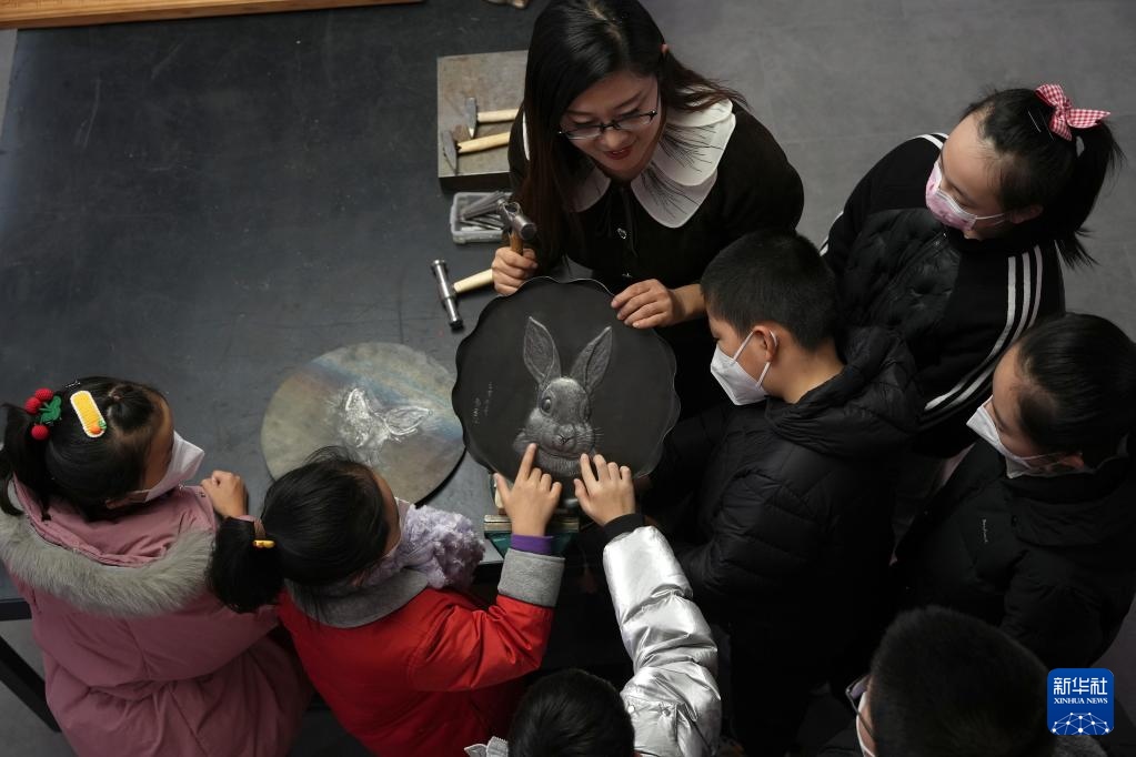 1月12日,在石家莊市新華區(qū)一個(gè)文化工作室,一名鐵板浮雕藝人向小朋友展示生肖兔作品。新華社記者 駱學(xué)峰 攝