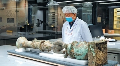 數(shù)字采集考古人員在實驗室,對三星堆出土文物進(jìn)行高光譜掃描。廣漢市委宣傳部供圖