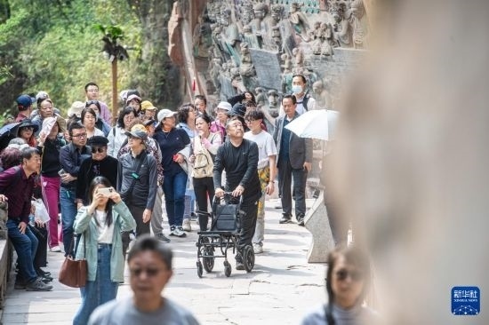 3月27日,游客在大足石刻景區(qū)參觀。