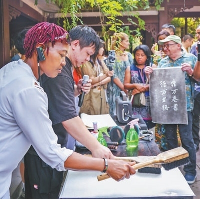2024“一帶一路”媒體合作論壇聯(lián)合采訪調(diào)研行成員在三蘇祠體驗拓印技藝。本報記者 伊 霄攝
