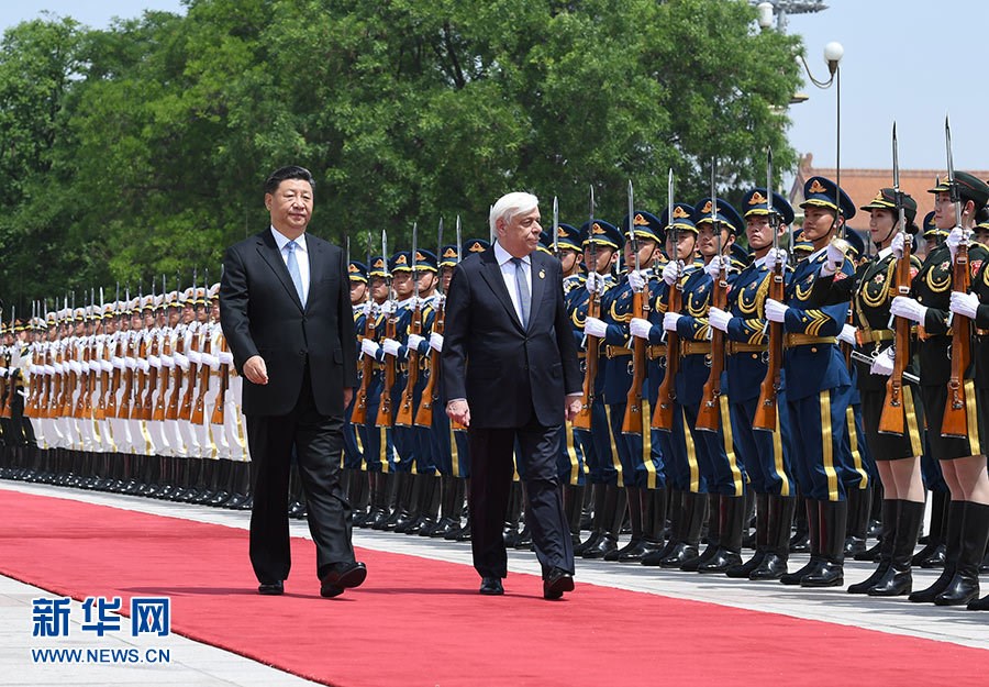 5月14日,國家主席習近平在北京人民大會堂同希臘總統(tǒng)帕夫洛普洛斯舉行會談。這是會談前,習近平在人民大會堂東門外廣場為帕夫洛普洛斯舉行歡迎儀式。 新華社記者 張領 攝