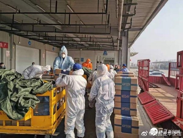英國(guó)政府援助醫(yī)療物資送抵中國(guó)。圖片來(lái)自英國(guó)駐華大使館微博賬號(hào)。