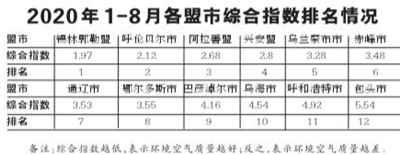 2020年1-8月,全區(qū)環(huán)境空氣質(zhì)量達(dá)標(biāo)天數(shù)比例平均為88.6%。12個(gè)盟市達(dá)標(biāo)天數(shù)比例由高至低依次為:呼倫貝爾市(100.0%)、錫林郭勒盟(98.8%)、興安盟(95.9%)、赤峰市(93.4%)、烏蘭察布市(93.4%)、阿拉善盟(92.6%)、鄂爾多斯市(88.5%)、通遼市(88.1%)、巴彥淖爾市(81.0%)、烏海市(79.1%)、包頭市(76.2%)和呼和浩特市(76.2%)。