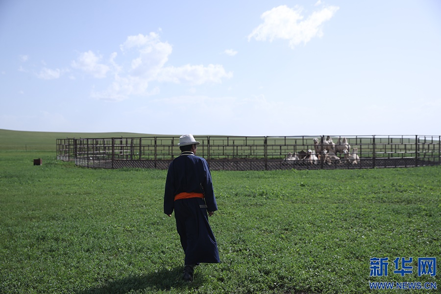 8月2日,其日麥拉圖在自家草場(chǎng)查看駱駝的喂養(yǎng)情況。新華網(wǎng)記者焦鵬攝