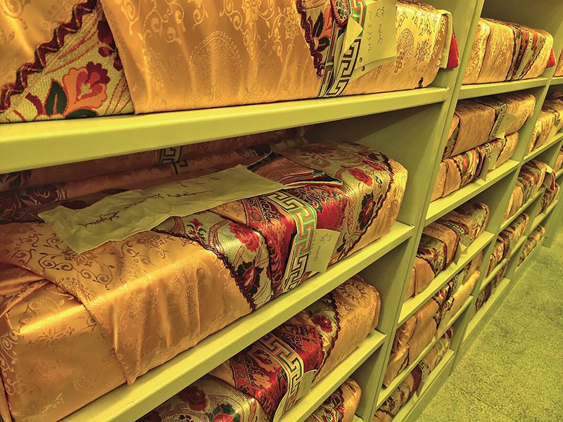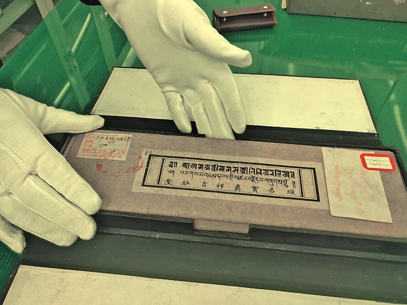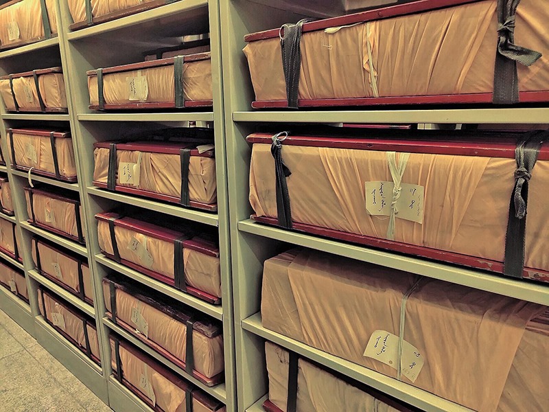 走入蒙古文古籍庫,上萬件古籍靜靜地?cái)[放著,在昏黃的特殊燈光照射下,一排排書架金光閃閃,一個個防磁柜就像知識的巨人并肩站立,歷史在這里塵封,也在這里開啟。