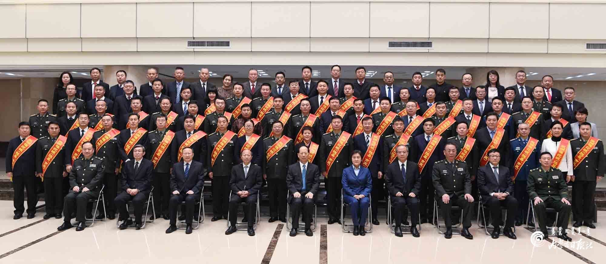 12月22日,石泰峰、布小林、李秀領(lǐng)等自治區(qū)領(lǐng)導(dǎo)在呼和浩特會見內(nèi)蒙古自治區(qū)雙擁模范城(旗縣、市區(qū))命名大會參會代表并合影。內(nèi)蒙古日報記者 袁永紅 攝