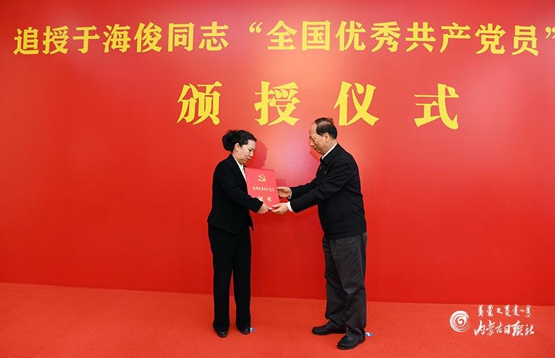 自治區(qū)有關部門單位負責同志及于海俊同志生前所在單位黨員干部代表參加頒授儀式。頒授儀式前,石泰峰等領導同志親切會見了于??⊥炯覍?。(內(nèi)蒙古日報記者 劉曉冬)