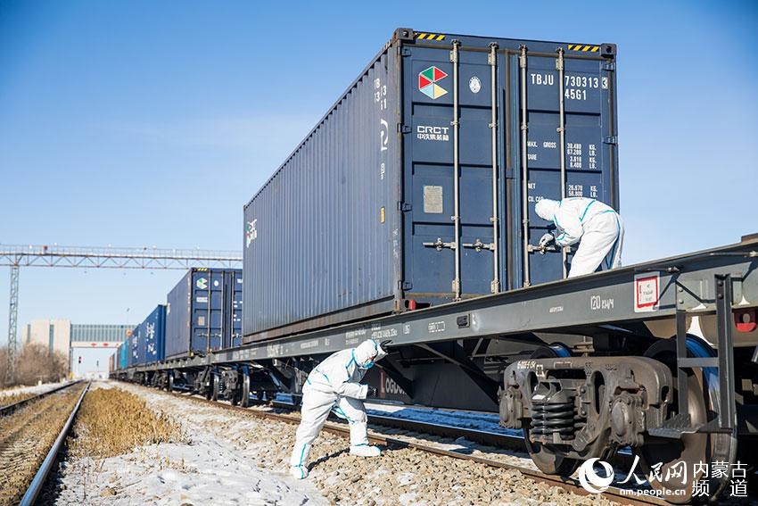 二連出入境邊防檢查站執(zhí)勤民警對(duì)中歐班列進(jìn)行車(chē)體檢查。郭鵬杰 攝