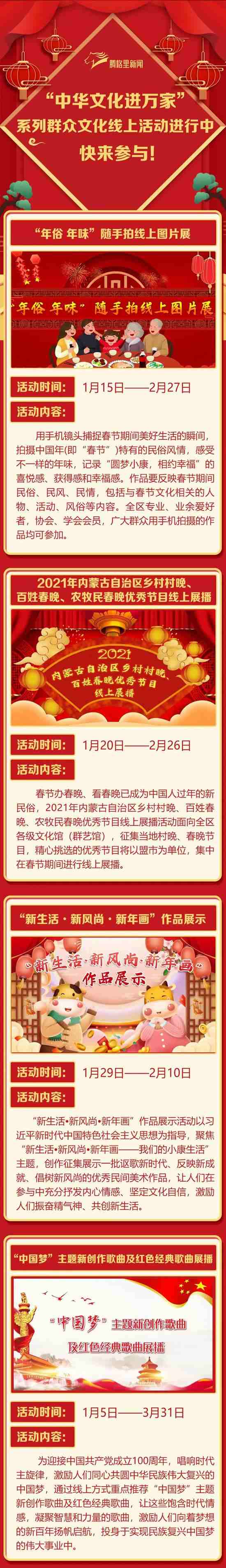 2021年春節(jié)的腳步越來越近,為豐富春節(jié)期間廣大群眾的精神文化生活,營造歡樂、團(tuán)圓、喜慶、祥和的節(jié)日氛圍,內(nèi)蒙古自治區(qū)文化和旅游廳(文化館)于2021年1月至3月將推出“中華文化進(jìn)萬家”系列群眾文化線上活動(dòng)。