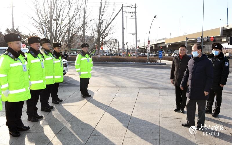1月31日,自治區(qū)黨委書記、人大常委會主任石泰峰,走訪呼和浩特市公安局交警支隊賽罕大隊九中隊崗?fù)ぃ赐繂栆痪€執(zhí)勤交警。內(nèi)蒙古日報社融媒體記者袁永紅攝
