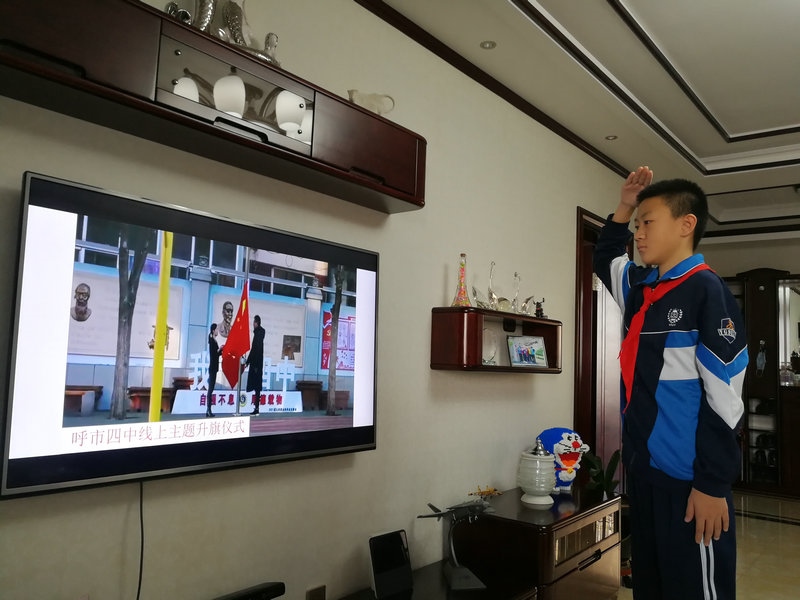 伴隨著激昂的《義勇軍進(jìn)行曲》,中小學(xué)生肅立屏幕前,看著冉冉升起的五星紅旗,高唱國歌,行隊(duì)禮,表達(dá)對偉大祖國的無限熱愛和崇高敬意。