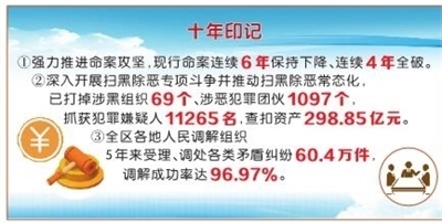 為將矛盾糾紛解決在基層一線,人民調(diào)解組織曉之以理、動之以情,化解疑難復(fù)雜案件,有效預(yù)防群體性事件、個人極端暴力事件和“民轉(zhuǎn)刑、刑轉(zhuǎn)命”案件。5年來,全區(qū)各地人民調(diào)解組織受理、調(diào)處各類矛盾糾紛60.4萬件,調(diào)解成功率達96.97%,實現(xiàn)了“案結(jié)事了人和”。