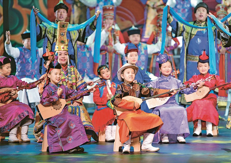 2022年9月4日,第八屆全國(guó)少數(shù)民族曲藝展演在內(nèi)蒙古自治區(qū)鄂爾多斯市開演。圖為演員在展演中表演蒙古族祝贊詞《禮贊新時(shí)代》。 人民圖片