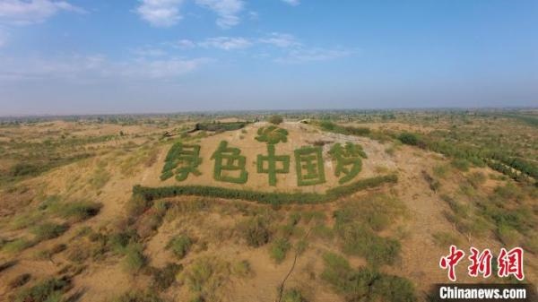 圖為寫有“綠色中國夢”字樣的庫布其沙漠。 張博供圖