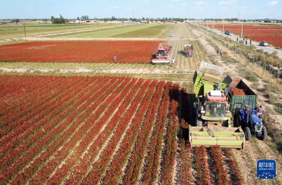 ??巴彥淖爾市臨河區(qū)白腦包鎮(zhèn)種植戶收獲辣椒。新華社記者李云平 攝