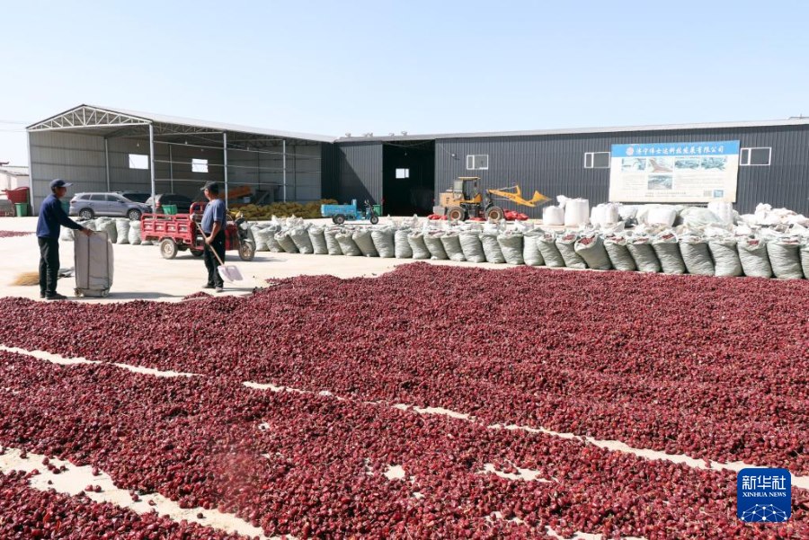 ??巴彥淖爾市臨河區(qū)白腦包鎮(zhèn)辣椒加工廠晾曬辣椒。新華社記者李云平 攝