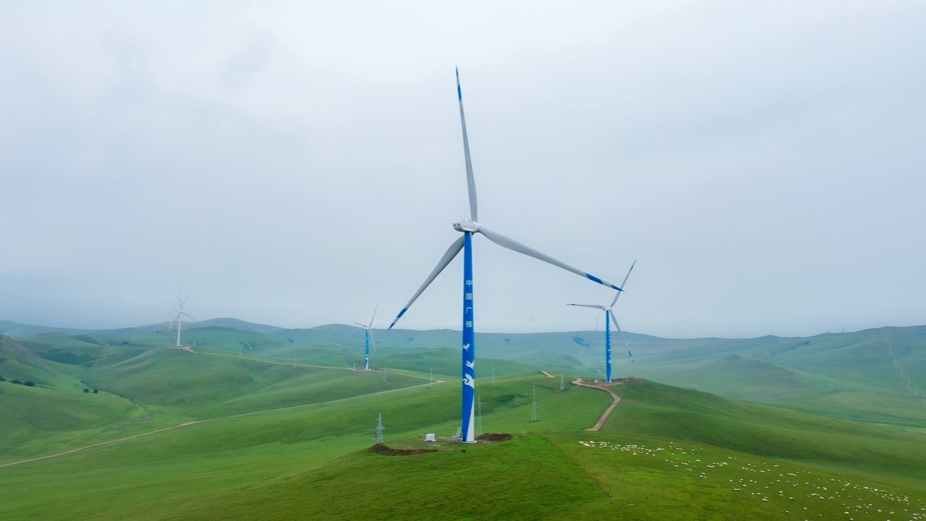 矗立在草原上的風電機組。