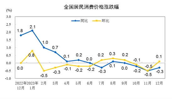 2023年12月份,全國(guó)居民消費(fèi)價(jià)格同比下降0.3%。其中,城市下降0.3%,農(nóng)村下降0.5%;食品價(jià)格下降3.7%,非食品價(jià)格上漲0.5%;消費(fèi)品價(jià)格下降1.1%,服務(wù)價(jià)格上漲1.0%。
