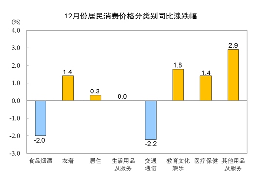 12月份,全國(guó)居民消費(fèi)價(jià)格環(huán)比上漲0.1%。其中,城市上漲0.1%,農(nóng)村上漲0.1%;食品價(jià)格上漲0.9%,非食品價(jià)格下降0.1%;消費(fèi)品價(jià)格上漲0.1%,服務(wù)價(jià)格上漲0.1%。