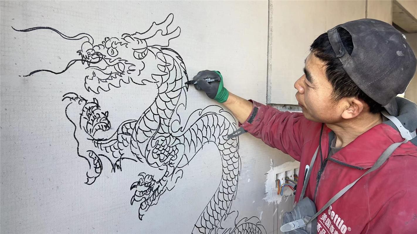 陳艷東在墻面上畫龍。