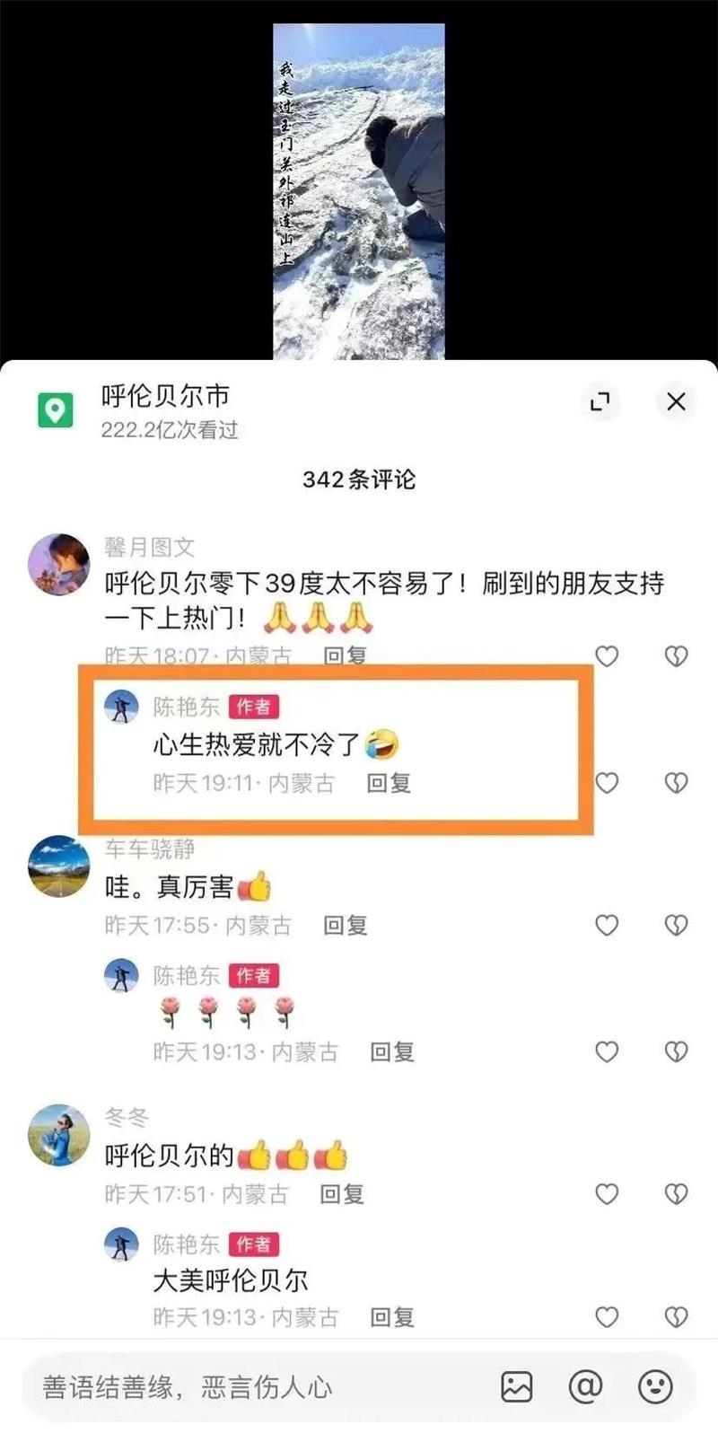 而他回復(fù):“心生熱愛就不冷了”