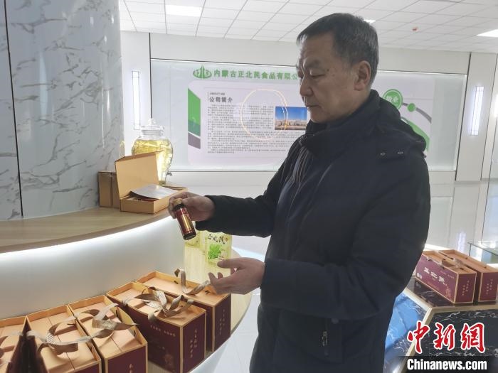 圖為范文宏為記者展示他的黃芪產(chǎn)品。李愛(ài)平攝