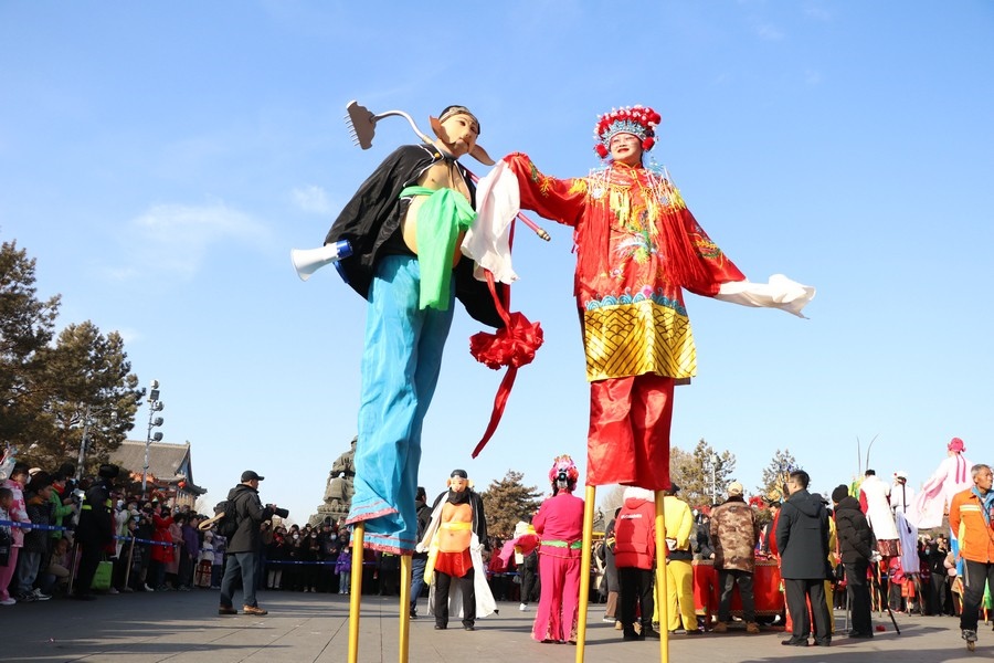 現(xiàn)場(chǎng)人潮涌動(dòng),歡聲笑語(yǔ)此起彼伏。扭秧歌隊(duì)伍身著色彩斑斕的服裝,手持彩扇,隨著歡快的音樂(lè)節(jié)奏,邁出輕盈的步伐,每一個(gè)動(dòng)作都充滿了力量感和韻律感。他們的表情歡快,笑容燦爛,將歡樂(lè)傳遞給每一位觀眾。與此同時(shí),踩高蹺也吸引了眾多觀眾的目光。演員們踩著高高的木蹺,身著華麗的戲服,扮演著各種角色,自如地行走、跳躍,引得觀眾陣陣喝彩。