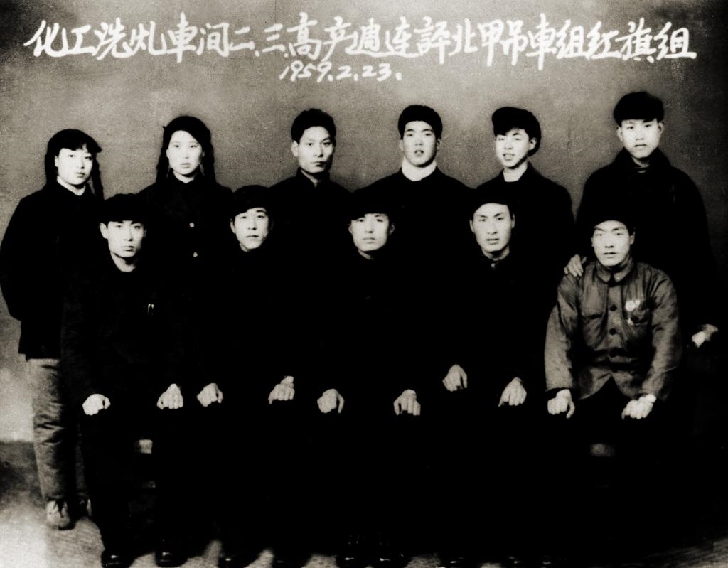↑1959年2月,雷鋒所在鞍鋼洗煤車(chē)間吊車(chē)組被評(píng)為紅旗組,這是雷鋒(后排右二)和工友合影。
