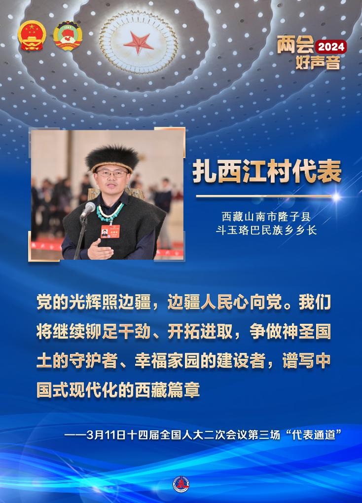 身著珞巴族服飾的西藏山南市隆子縣斗玉珞巴民族鄉(xiāng)鄉(xiāng)長扎西江村代表走上通道,并帶來好消息:位于斗玉鄉(xiāng)的珞巴民族歷史文化展覽館即將開館。