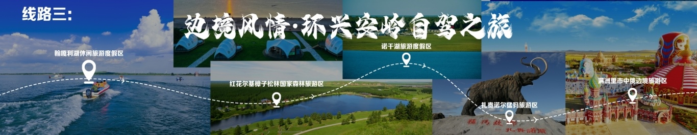 線路行程由烏蘭浩特出發(fā),至翰嘎利湖休閑旅游度假區(qū)出發(fā),再至紅花爾基樟子松林國家森林旅游區(qū),再至諾干湖旅游度假區(qū),再至扎賚諾爾猛犸旅游區(qū),終點為滿洲里市中俄邊境旅游區(qū)。
