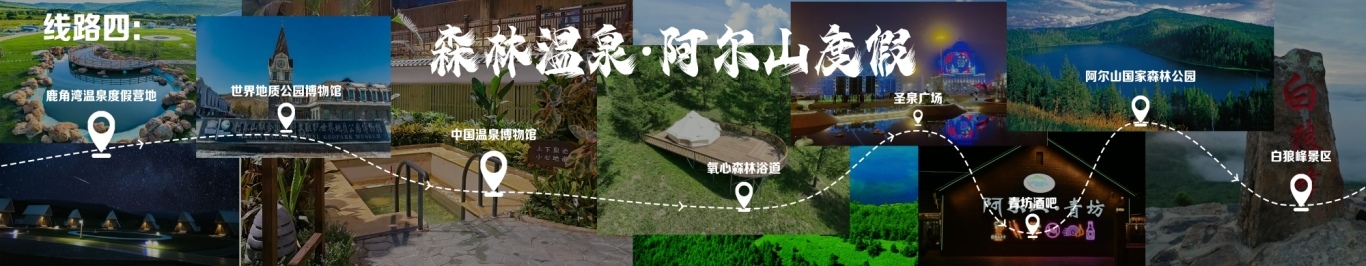 線路行程由阿爾山出發(fā),至鹿角灣溫泉度假營地,至世界地質公園博物館,至中國溫泉博物館,再至氧心森林浴道,再至圣泉廣場,再至青坊酒吧,再至阿爾山國家森林公園,終點為白狼峰景區(qū)。