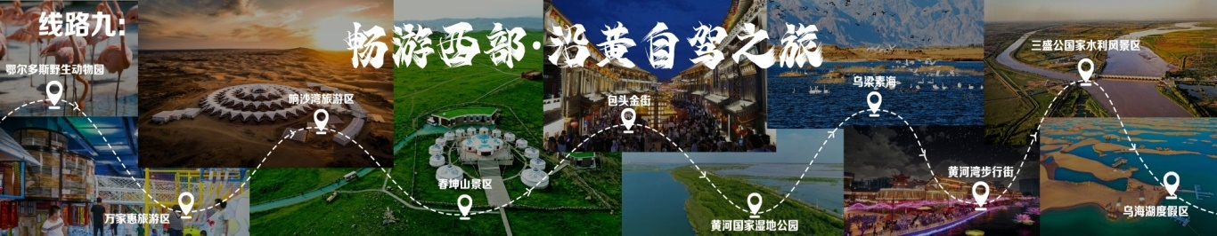 線路行程由鄂爾多斯出發(fā),至鄂爾多斯野生動物園,至萬家惠旅游區(qū),至響沙灣旅游區(qū)。到達包頭,至春坤山景區(qū),再至包頭金街,至黃河國家濕地公園。到達巴彥淖爾,至烏梁素海,再至黃河灣步行街,再至三盛公國家水利風景區(qū),終點為烏海湖度假區(qū)。
